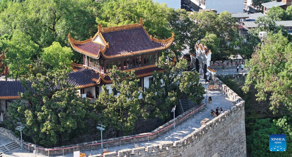 An aerial photo taken on Oct. 5, 2025 shows tourists at a scenic spot in Xiangyang City, central China's Hubei Province. As China's National Day and Mid-Autumn Festival holidays converge, the nation's cultural activities, bustling transport networks and innovative consumption scenes are painting a vivid picture of economic resilience and growth potential. (Photo by Yang Dong/Xinhua)