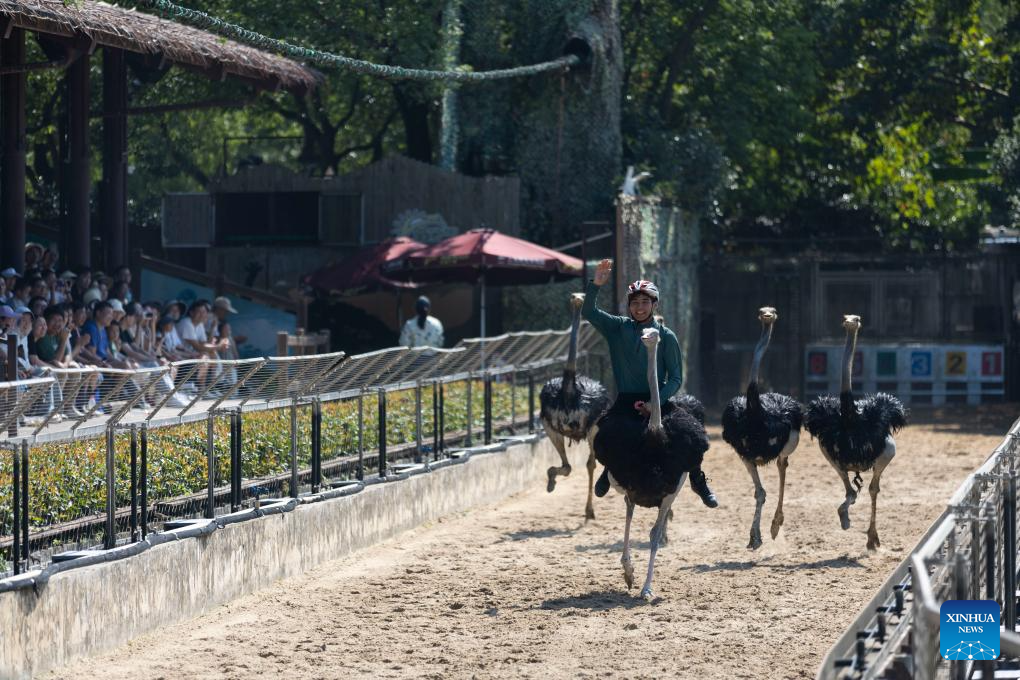 People watch running ostriches at a zoo in east China's Shanghai, Oct. 6, 2025. As China's National Day and Mid-Autumn Festival holidays converge, the nation's cultural activities, bustling transport networks and innovative consumption scenes are painting a vivid picture of economic resilience and growth potential. (Xinhua/Wang Xiang)