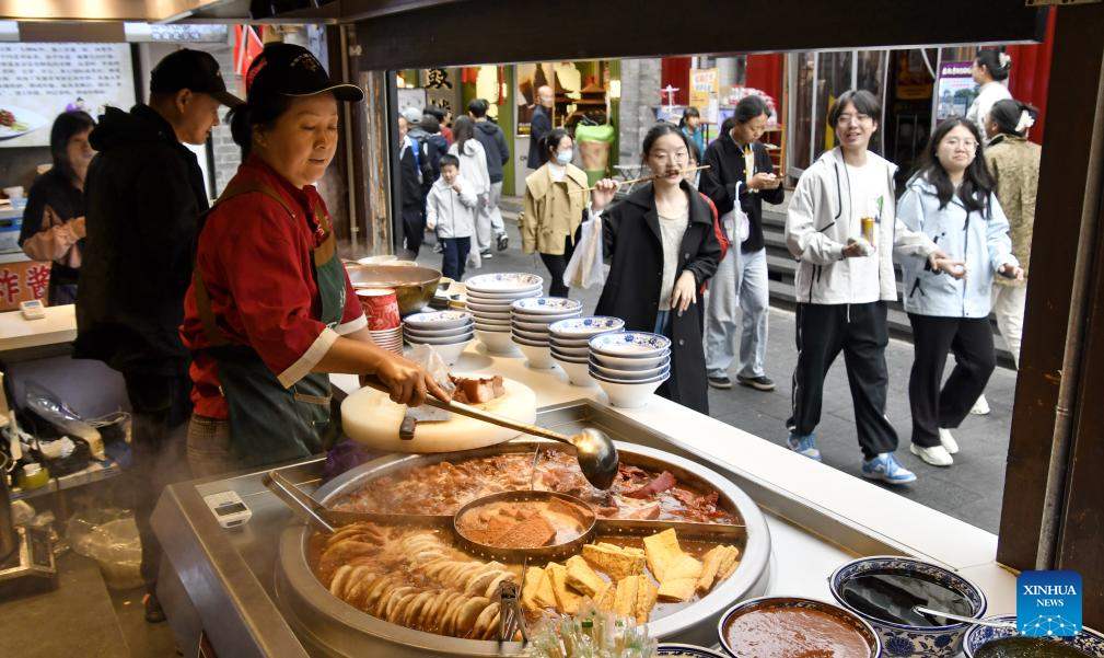 Tourists visit the Yandaixiejie street in Beijing, capital of China, Oct. 6, 2025. As China's National Day and Mid-Autumn Festival holidays converge, the nation's cultural activities, bustling transport networks and innovative consumption scenes are painting a vivid picture of economic resilience and growth potential. (Xinhua/Li Xin)