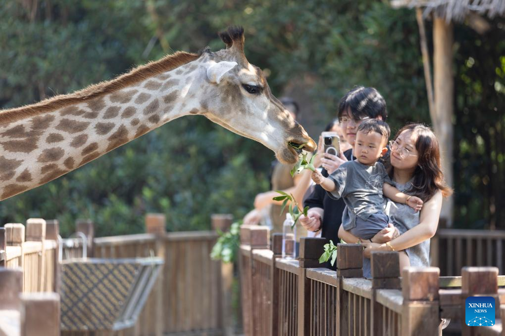 A child interacts with a giraffe at a zoo in east China's Shanghai, Oct. 6, 2025. As China's National Day and Mid-Autumn Festival holidays converge, the nation's cultural activities, bustling transport networks and innovative consumption scenes are painting a vivid picture of economic resilience and growth potential. (Xinhua/Wang Xiang)