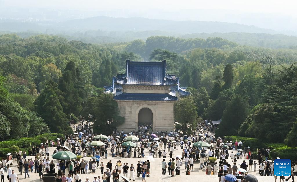 People visit Sun Yat-sen Mausoleum in Nanjing, east China's Jiangsu Province, Oct. 5, 2025. As China's National Day and Mid-Autumn Festival holidays converge, the nation's cultural activities, bustling transport networks and innovative consumption scenes are painting a vivid picture of economic resilience and growth potential. (Xinhua/Li He)