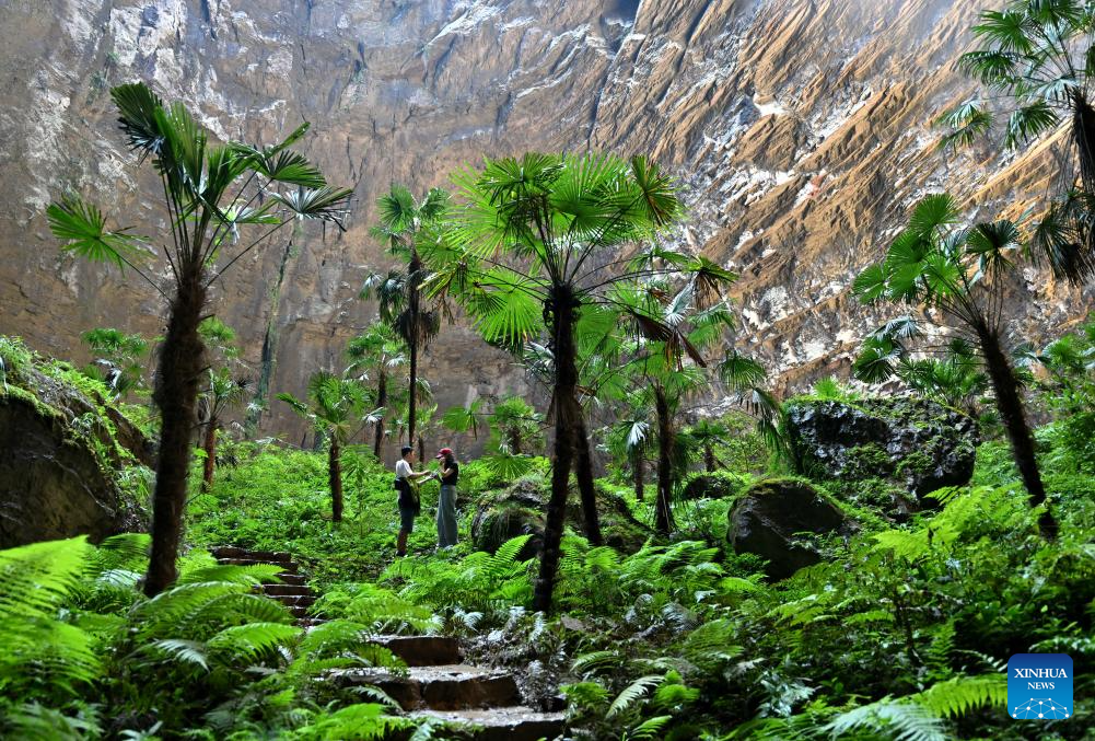 Tourists are seen at the bottom of the Luoquanyan sinkhole, which measures 290 meters in depth, in Xuan'en County, central China's Hubei Province, Oct. 6, 2025. As China's National Day and Mid-Autumn Festival holidays converge, the nation's cultural activities, bustling transport networks and innovative consumption scenes are painting a vivid picture of economic resilience and growth potential. (Photo by Song Wen/Xinhua)