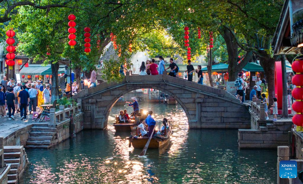 This drone photo taken on Oct. 6, 2025 shows tourists taking a boat at a scenic area in Suzhou, east China's Jiangsu Province. As China's National Day and Mid-Autumn Festival holidays converge, the nation's cultural activities, bustling transport networks and innovative consumption scenes are painting a vivid picture of economic resilience and growth potential. (Photo by Zhou Shegen/Xinhua)