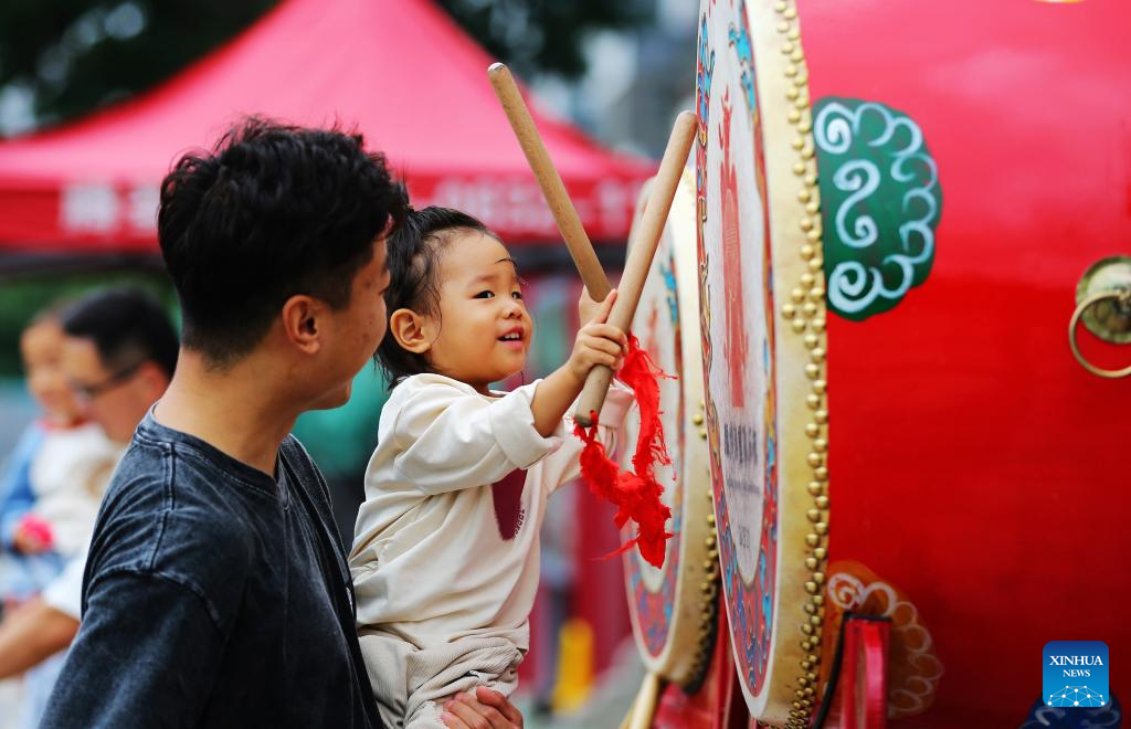 A child plays with a drum in Tengzhou, east China's Shandong Province, Oct. 6, 2025. As China's National Day and Mid-Autumn Festival holidays converge, the nation's cultural activities, bustling transport networks and innovative consumption scenes are painting a vivid picture of economic resilience and growth potential. (Photo by Li Zhijun/Xinhua)
