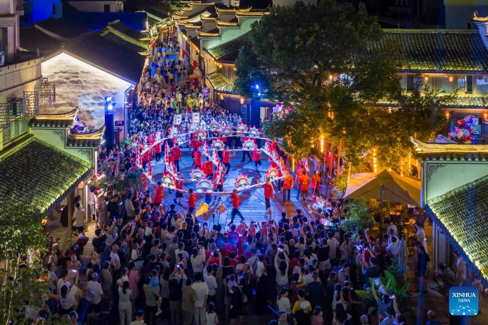 An aerial photo taken on Oct. 5, 2025 shows tourists watching a parade in Pujiang County, east China's Zhejiang Province. As China's National Day and Mid-Autumn Festival holidays converge, the nation's cultural activities, bustling transport networks and innovative consumption scenes are painting a vivid picture of economic resilience and growth potential. (Photo by Zhang Hui/Xinhua)