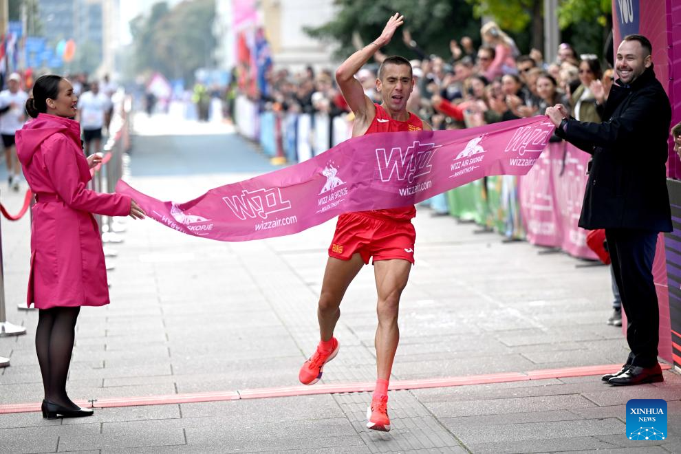 Dario Ivanovski of North Macedonia crosses the finish line during Skopje Marathon in Skopje, North Macedonia, Oct. 5, 2025. (Photo by Tomislav Georgiev/Xinhua)
