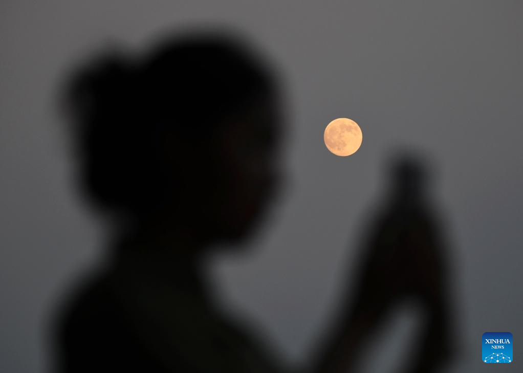 A tourist checks photos of the full moon near the West Lake in Hangzhou, east China's Zhejiang Province, Oct. 6, 2025. Monday marks this year's Mid-Autumn Festival, which is celebrated annually on the 15th day of the eighth month in the Chinese lunar calendar. People across China admire the full moon to celebrate the traditional holiday. (Photo by Long Wei/Xinhua)