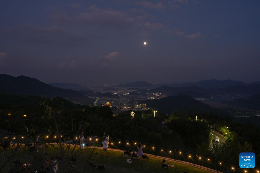 A full moon is pictured in Cangnan County of Wenzhou, east China's Zhejiang Province, Oct. 6, 2025. Monday marks this year's Mid-Autumn Festival, which is celebrated annually on the 15th day of the eighth month in the Chinese lunar calendar. People across China admire the full moon to celebrate the traditional holiday. (Photo by Su Qiaojiang/Xinhua)