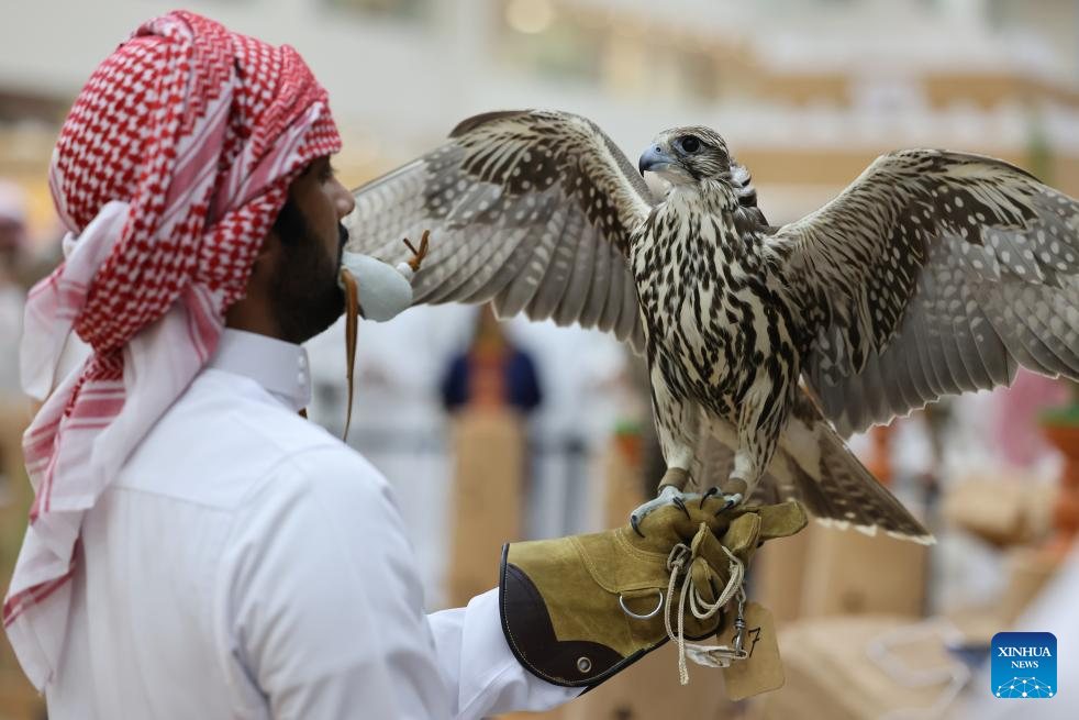 An exhibitor shows a falcon to visitors during the Saudi International Falcons and Hunting Exhibition 2025 in Riyadh, Saudi Arabia, Oct. 6, 2025. The Saudi International Falcons and Hunting Exhibition 2025 opened in Riyadh on Oct. 2, with more than 1,300 exhibitors and brands from 45 countries showcasing their latest innovations. The exhibition will run until Oct. 11.