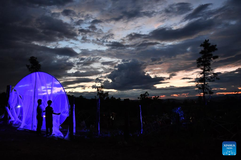 Zhou Yan (L, up), volunteers and villagers set up an artistic house in Dayuan Village of Ningyuan County, central China's Hunan Province, Aug. 20, 2023. (Xinhua/Chen Zhenhai)