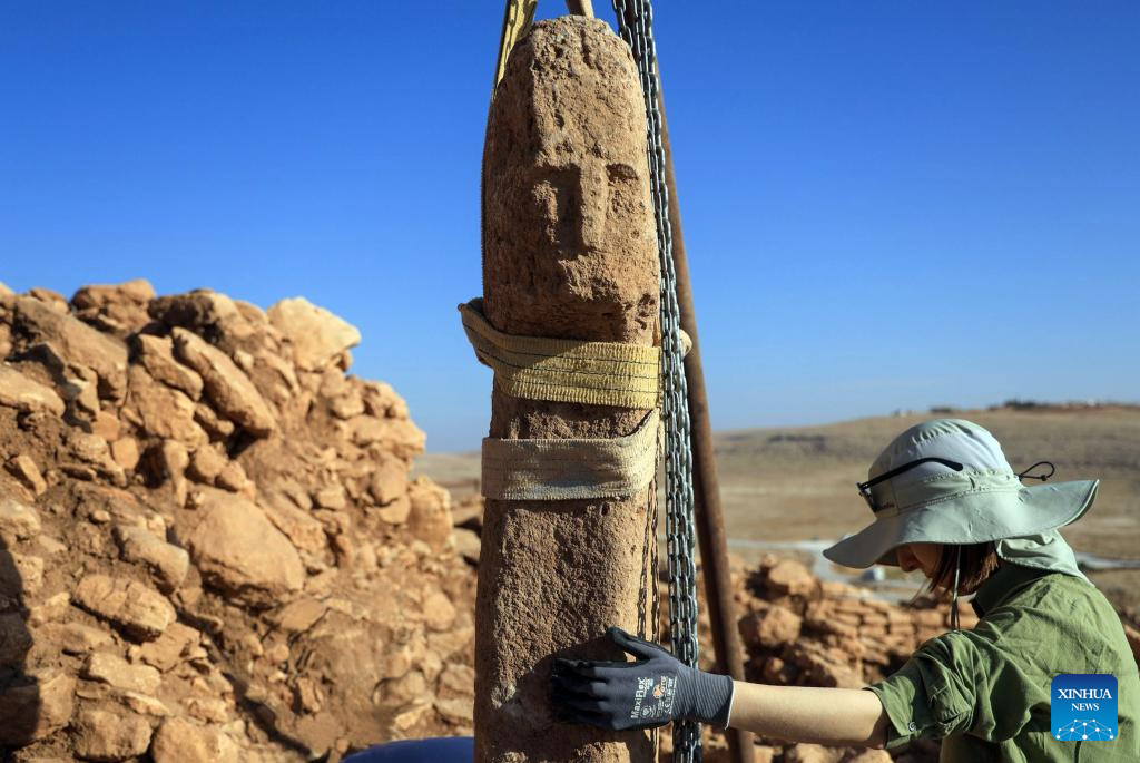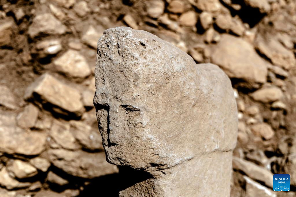 ANKARA, Oct. 6 (Xinhua) -- A T-shaped pillar carved with a human face has been unearthed for the first time during recent excavations at the Karahantepe archaeological site in southeastern Türkiye, a cabinet minister announced on Monday.