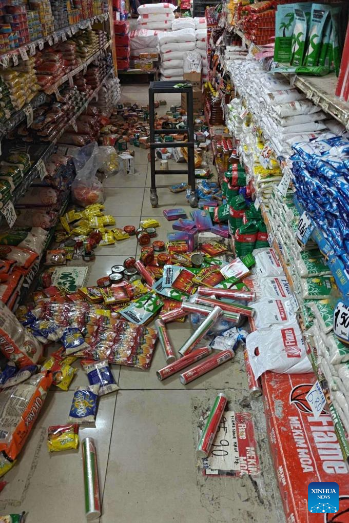 This photo taken with a mobile phone on Oct. 7, 2025 shows goods fallen from shelves at a supermarket after an earthquake in Lae, Papua New Guinea. An earthquake with a magnitude of 6.7 jolted 21 km W of Lae, Papua New Guinea at 1105 GMT on Tuesday, the U.S. Geological Survey said. (Meet PNG/Handout via Xinhua)