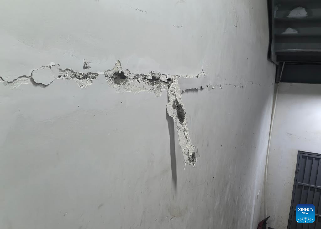 This photo taken with a mobile phone on Oct. 7, 2025 shows cracks appearing on the wall in a building after an earthquake in Lae, Papua New Guinea. An earthquake with a magnitude of 6.7 jolted 21 km W of Lae, Papua New Guinea at 1105 GMT on Tuesday, the U.S. Geological Survey said.