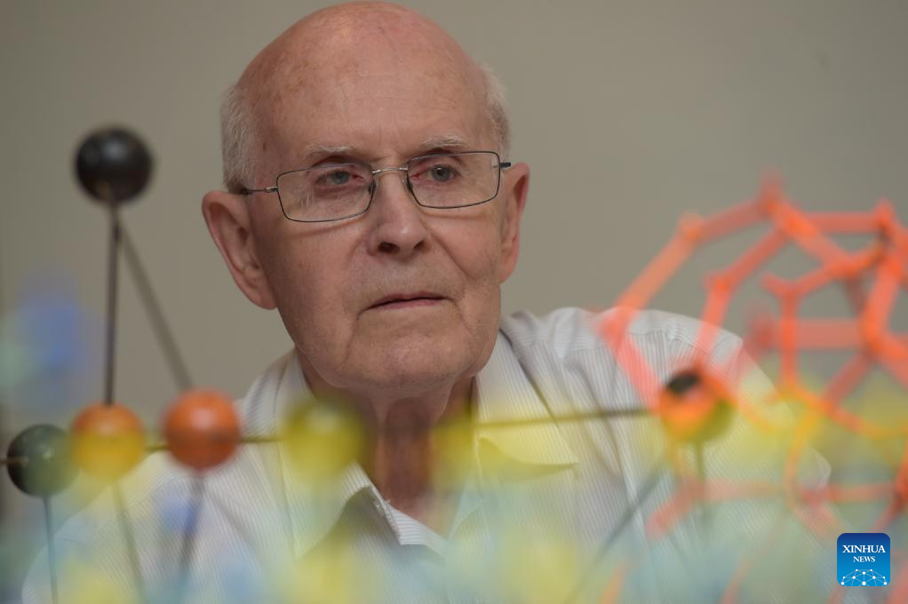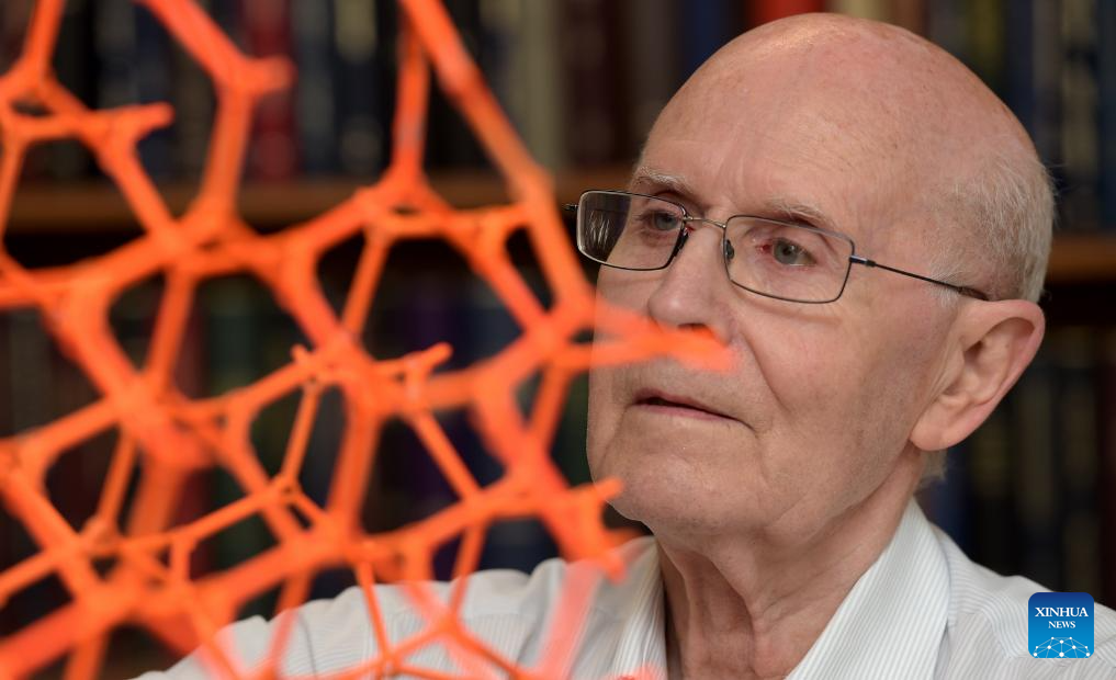 This photo taken on Oct. 9, 2025 shows Professor Richard Robson and the model of metal-organic frameworks in Melbourne, Australia. Richard Robson was awarded the 2025 Nobel Prize in Chemistry together with two other scientists for developing metal-organic frameworks (MOFs). (University of Melbourne/Handout via Xinhua)