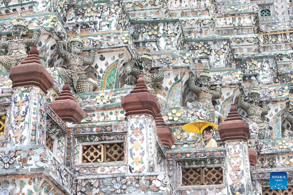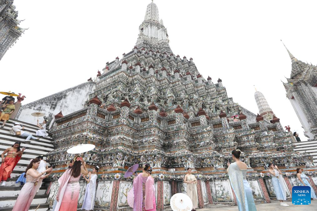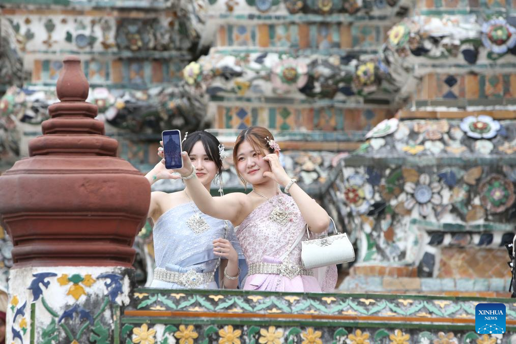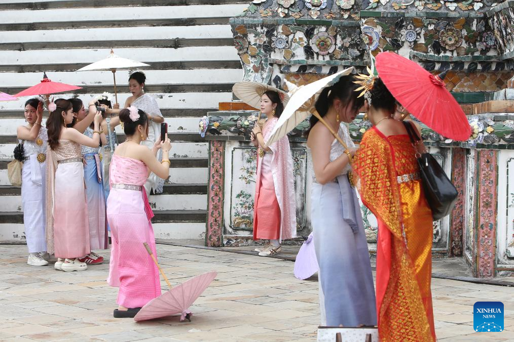 Tourists in Thai traditional costumes are seen at the Wat Arun in Bangkok, Thailand, Oct. 9, 2025. (Xinhua/Rachen Sageamsak)