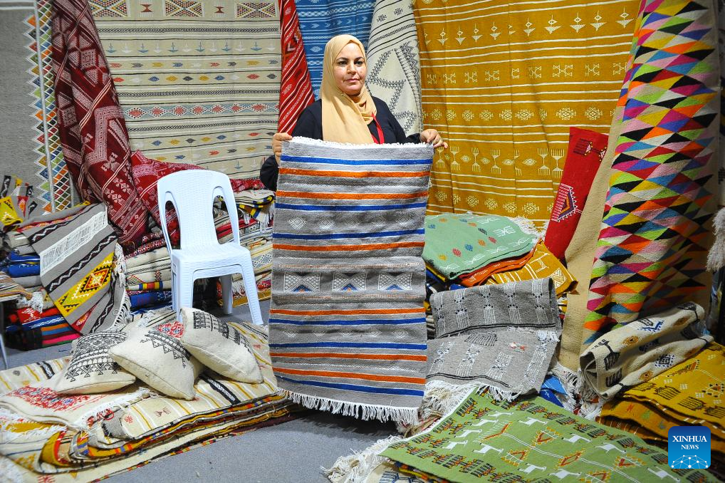 A merchant shows a handmade carpet to customers at a handicrafts fair in Tunis, Tunisia, Oct. 8, 2025. The second Tunisian Handicrafts Fair is held here from Oct. 6 to 12, with over 150 handicraft vendors participating. (Photo by Adel Ezzine/Xinhua)