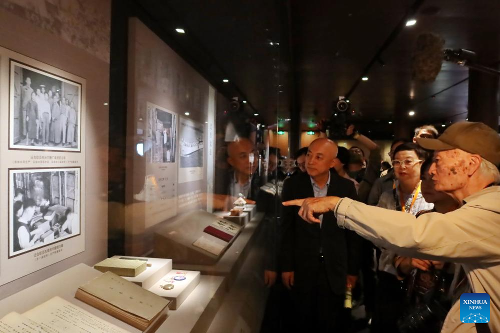 Chuang Ling (1st R), the son of Chuang Yan, former vice curator of the Palace Museum in Taipei, introduces the exhibits at an exhibition commemorating the miraculous evacuation of the Palace Museum's collection during Chinese People's War of Resistance against Japanese Aggression more than 80 years ago, in Beijing, capital of China, Sept. 30, 2025. (Xinhua)