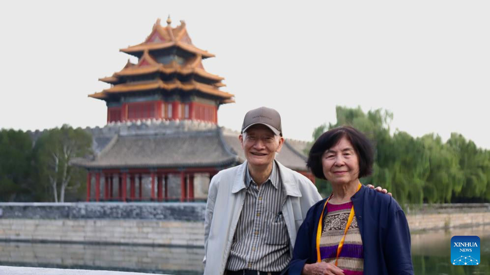 Chuang Ling, the son of Chuang Yan, former vice curator of the Palace Museum in Taipei, poses for a photo with his wife while visiting Beijing for an exhibition commemorating the miraculous evacuation of the Palace Museum's collection during Chinese People's War of Resistance against Japanese Aggression more than 80 years ago, in Beijing, capital of China, Sept. 30, 2025. (Xinhua/Zhu Na)