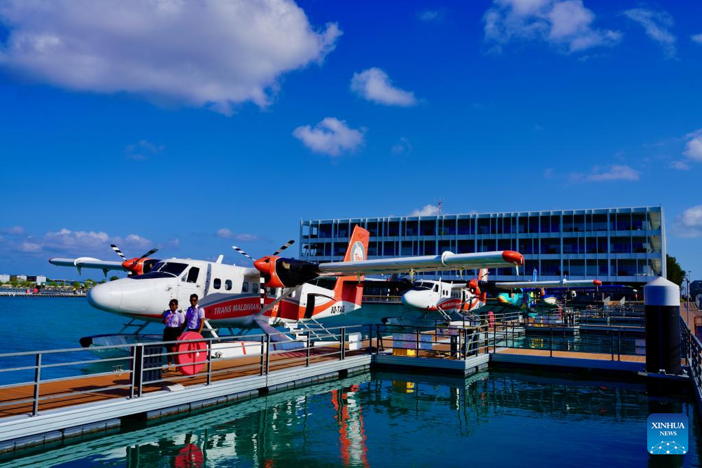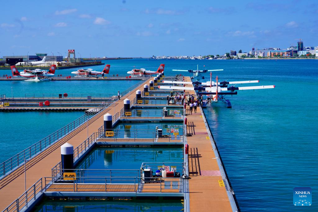 This photo taken on Oct. 3, 2025 shows a seaplane docking facility in Male, the Maldives. (Xinhua/Wu Yue)