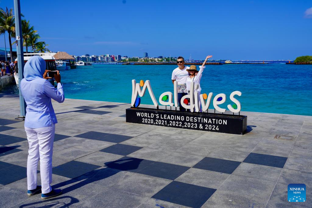 People pose for a photo near the Velana International Airport in Maldives, Oct. 3, 2025. (Xinhua/Wu Yue)