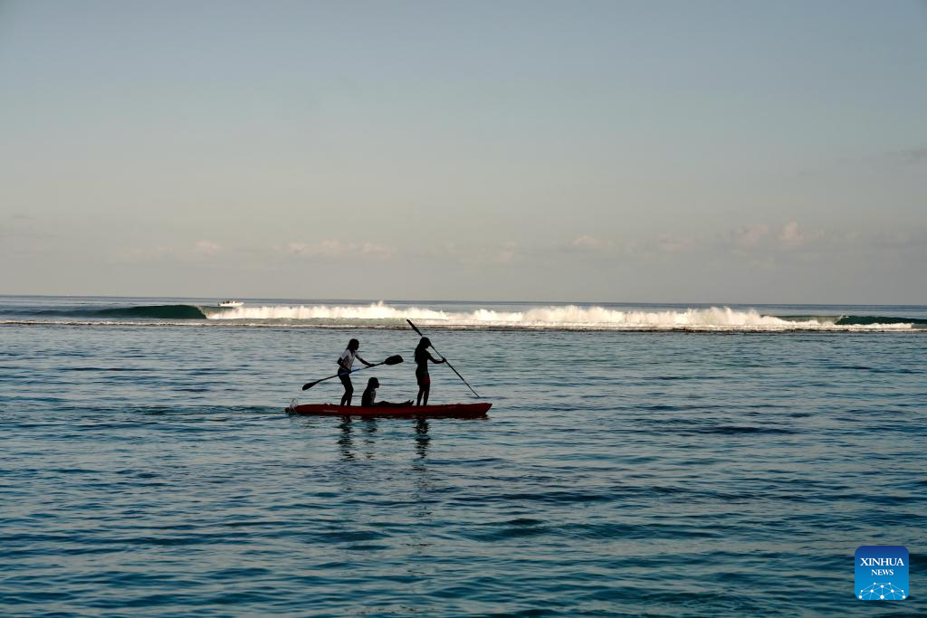 People row a boat on the sea in Hulhumale, Maldives, Oct. 3, 2025. (Xinhua/Wu Yue)