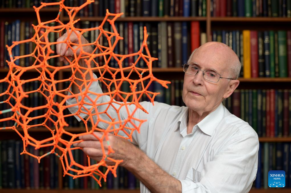 This photo taken on Oct. 9, 2025 shows Professor Richard Robson and the model of metal-organic frameworks in Melbourne, Australia. Richard Robson was awarded the 2025 Nobel Prize in Chemistry together with two other scientists for developing metal-organic frameworks (MOFs). (University of Melbourne/Handout via Xinhua)