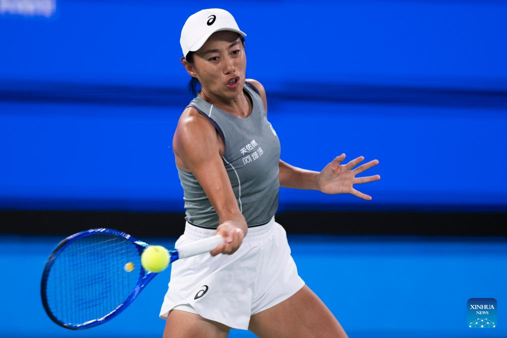 Zhang Shuai of China hits a return during the women's singles round of 16 match against Coco Gauff of the United States at the 2025 Wuhan Open tennis tournament in Wuhan, central China's Hubei Province, Oct. 9, 2025. (Xinhua/Wu Zhizun)