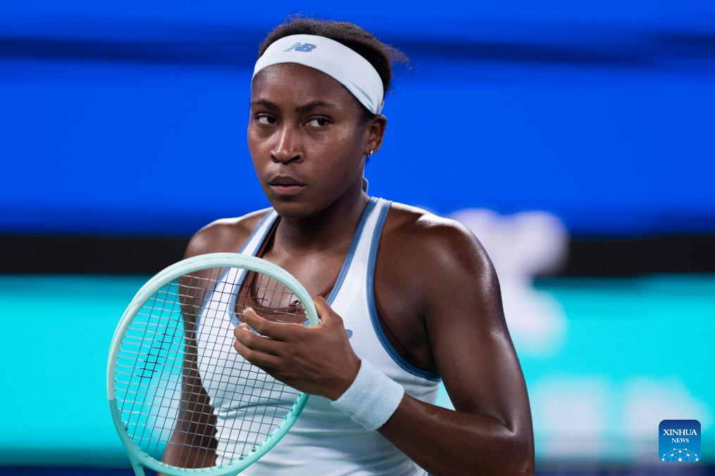 Coco Gauff of the United States reacts during the women's singles round of 16 match against Zhang Shuai of China at the 2025 Wuhan Open tennis tournament in Wuhan, central China's Hubei Province, Oct. 9, 2025. (Xinhua/Wu Zhizun)