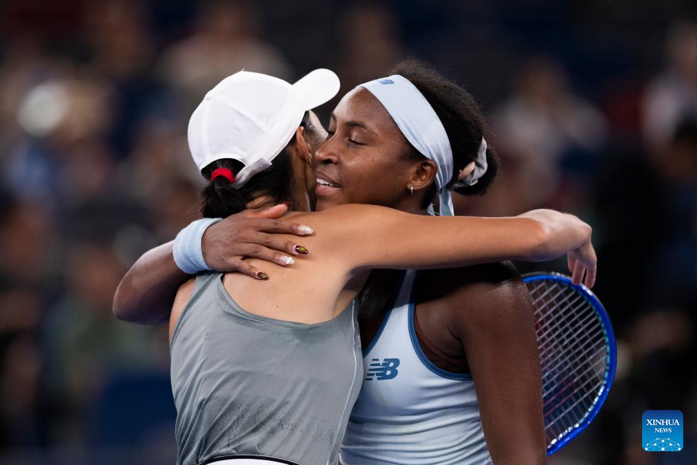 Coco Gauff (R) of the United States hugs Zhang Shuai of China after their women's singles round of 16 match at the 2025 Wuhan Open tennis tournament in Wuhan, central China's Hubei Province, Oct. 9, 2025. (Xinhua/Wu Zhizun)