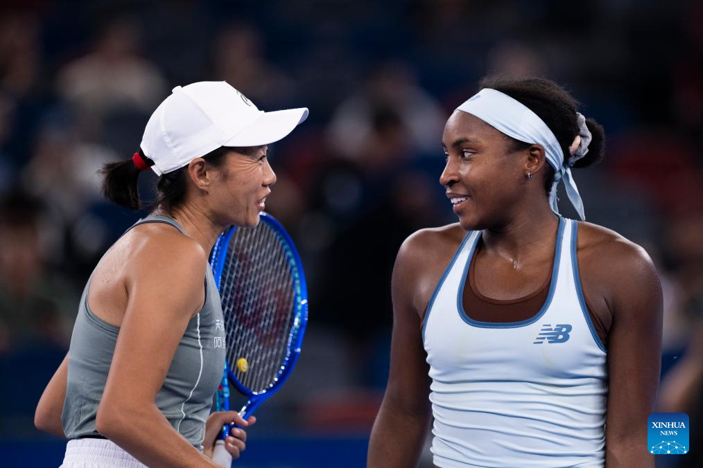 Coco Gauff (R) of the United States greets Zhang Shuai of China after their women's singles round of 16 match at the 2025 Wuhan Open tennis tournament in Wuhan, central China's Hubei Province, Oct. 9, 2025. (Xinhua/Wu Zhizun)
