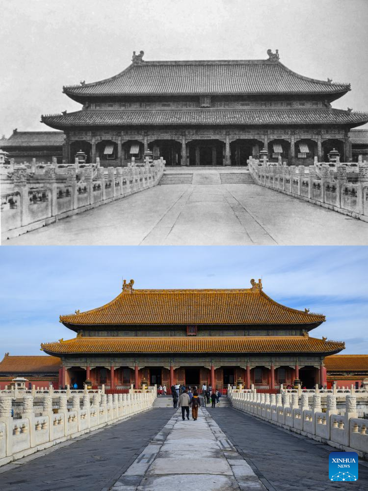 This combo photo shows the Hall of Preserving Harmony (Baohe dian) of the Palace Museum in the early 20th century (above, provided by the Palace Museum) and on Oct. 10, 2025 (below, photo by Xinhua photographer Jin Liangkuai) in Beijing, capital of China. This year marks the 100th anniversary of the founding of the Palace Museum.