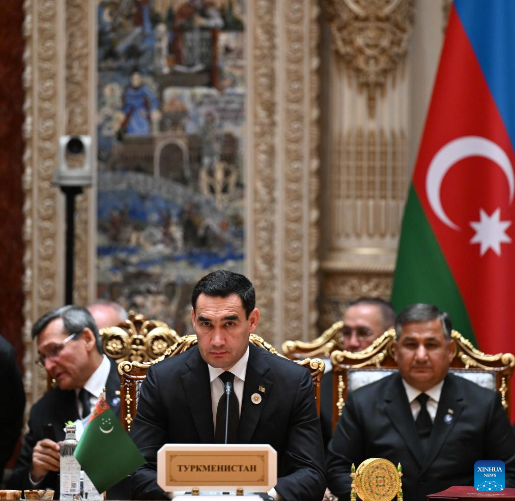 Turkmen President Serdar Berdimuhamedov (C) attends a meeting of the Council of Heads of State of the Commonwealth of Independent States (CIS) in Dushanbe, Tajikistan, on Oct. 10, 2025. A meeting of the Council of Heads of State of the CIS was held here Friday to review security and military cooperation, said the press service of the CIS Executive Committee. (Xinhua/Li Renzi)