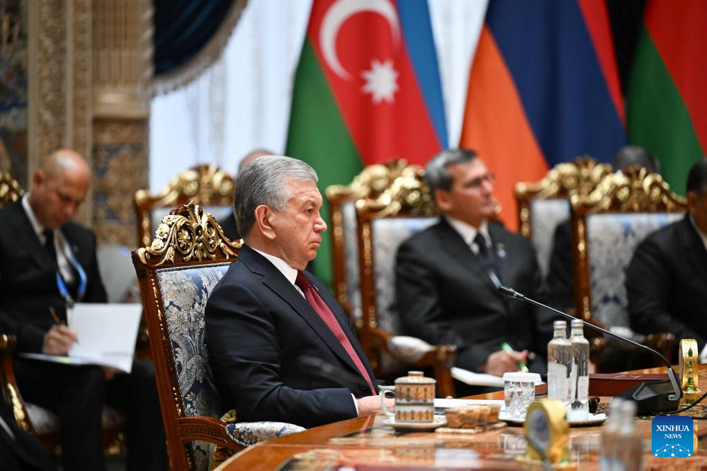 Uzbek President Shavkat Mirziyoyev attends a meeting of the Council of Heads of State of the Commonwealth of Independent States (CIS) in Dushanbe, Tajikistan, on Oct. 10, 2025. A meeting of the Council of Heads of State of the CIS was held here Friday to review security and military cooperation, said the press service of the CIS Executive Committee. (Xinhua/Li Renzi)