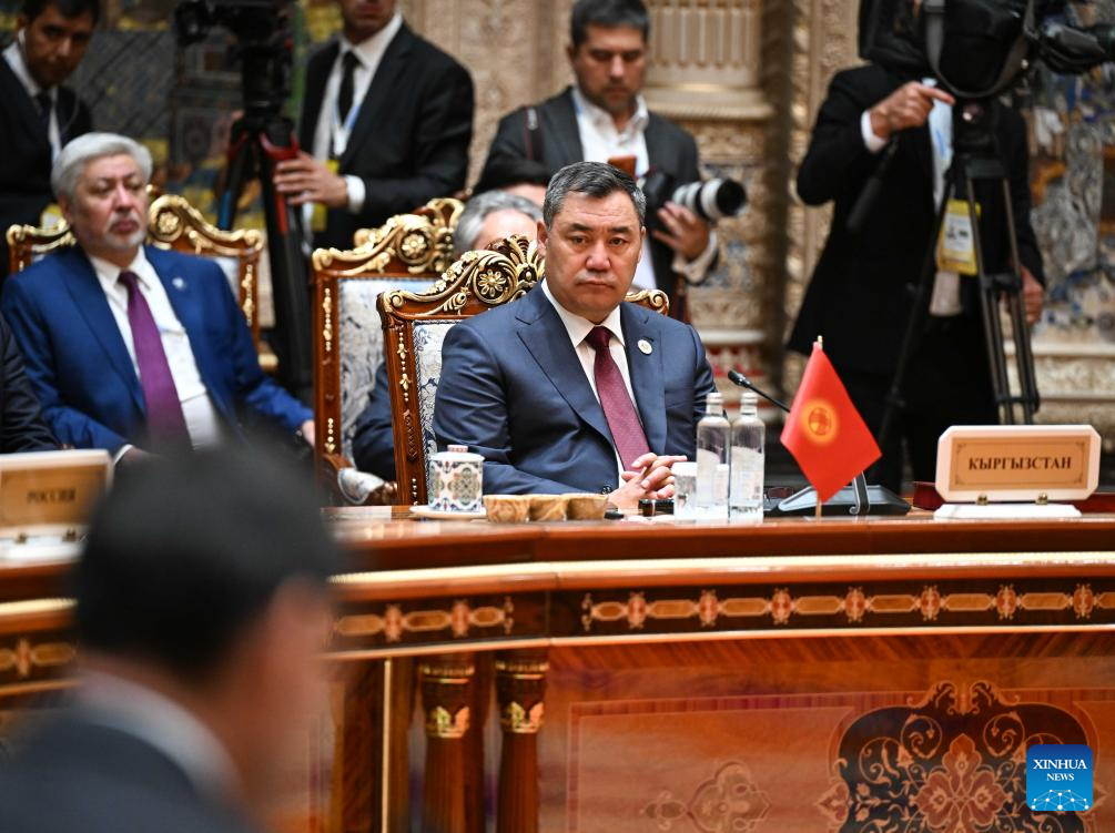 Kyrgyz President Sadyr Japarov (C) attends a meeting of the Council of Heads of State of the Commonwealth of Independent States (CIS) in Dushanbe, Tajikistan, on Oct. 10, 2025. A meeting of the Council of Heads of State of the CIS was held here Friday to review security and military cooperation, said the press service of the CIS Executive Committee. (Xinhua/Li Renzi)