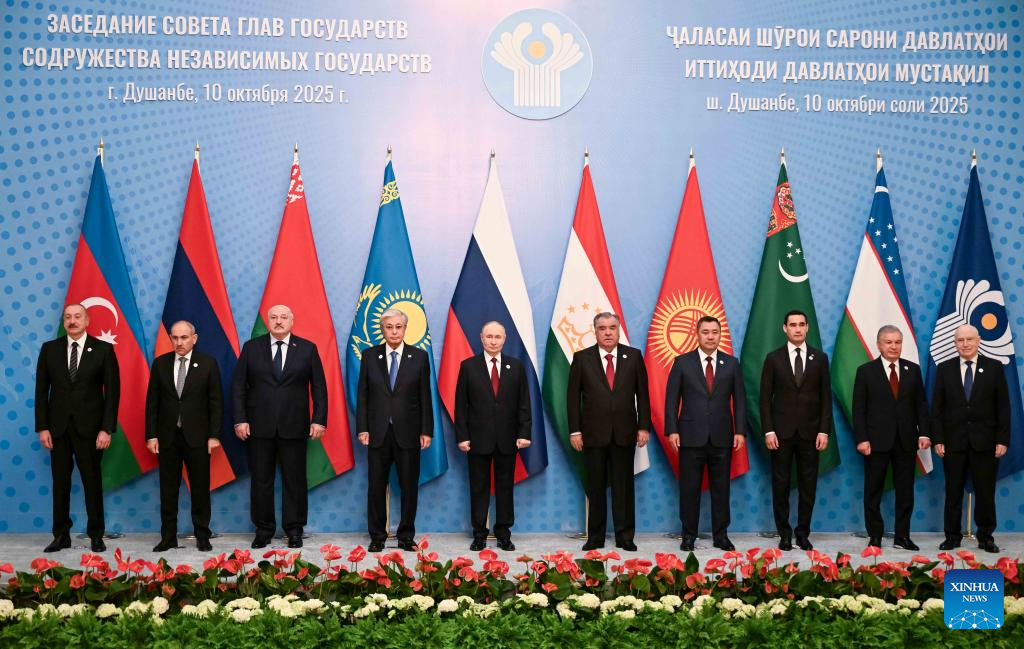 Representatives pose for group photos before a meeting of the Council of Heads of State of the Commonwealth of Independent States (CIS) in Dushanbe, Tajikistan, on Oct. 10, 2025. A meeting of the Council of Heads of State of the CIS was held here Friday to review security and military cooperation, said the press service of the CIS Executive Committee. (Xinhua/Li Renzi)