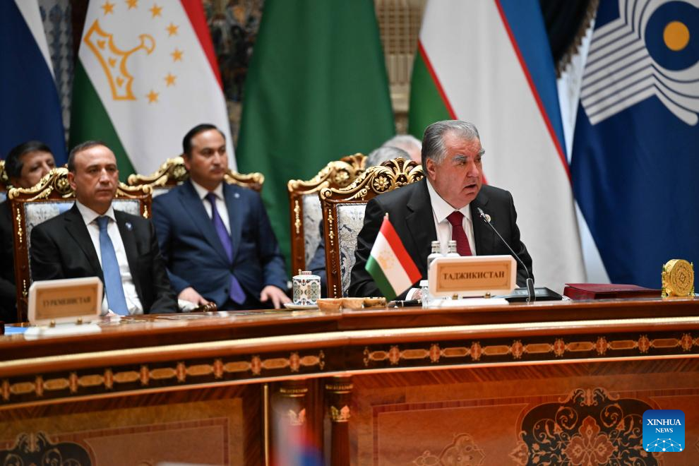 Tajik President Emomali Rahmon (R) attends a meeting of the Council of Heads of State of the Commonwealth of Independent States (CIS) in Dushanbe, Tajikistan, on Oct. 10, 2025. A meeting of the Council of Heads of State of the CIS was held here Friday to review security and military cooperation, said the press service of the CIS Executive Committee. (Xinhua/Li Renzi)