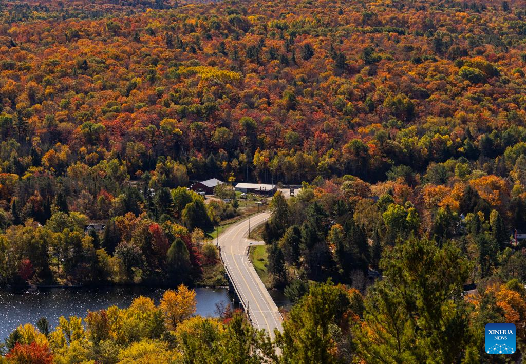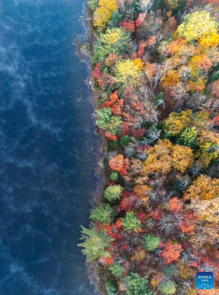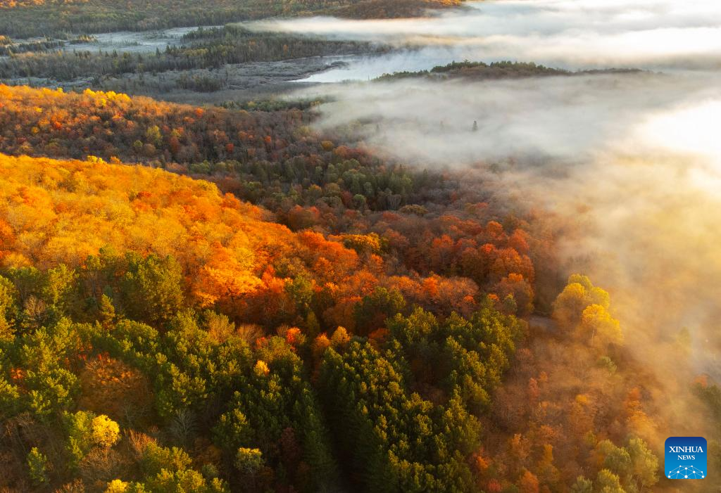 An aerial drone photo taken on Oct. 9, 2025 shows the autumn scenery near Huntsville, Ontario, Canada. (Photo by Zou Zheng/Xinhua)