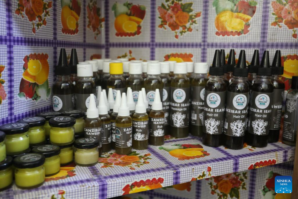 Seaweed-based products including hair oil, massage oil, and balm are seen displayed at the Wakulima Hai cooperative society in Zanzibar, Tanzania, Oct. 4, 2025. (Xinhua/Nurdin Pallangyo)