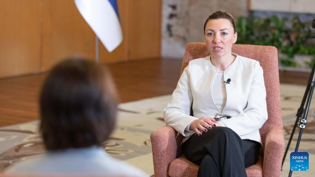 Tatjana Macura, Serbia's minister without portfolio in charge of gender equality, the prevention of violence against women, and economic and political empowerment of women, speaks in an exclusive interview with Xinhua in Belgrade, Serbia, Oct. 2, 2025. (Photo by Wang Wei/Xinhua)