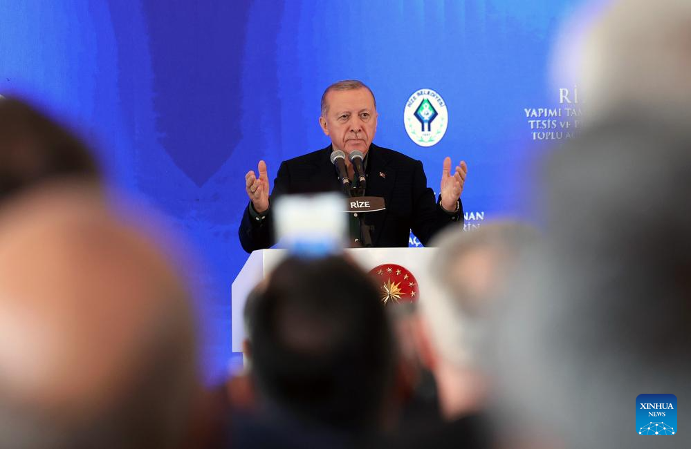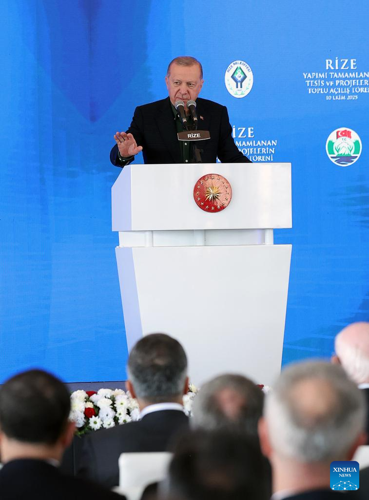 Turkish President Recep Tayyip Erdogan makes a speech at a ceremony inaugurating new projects in the Black Sea province of Rize, Türkiye, Oct. 10, 2025. Erdogan on Friday said it is necessary to prevent Israel from breaking the Gaza ceasefire promises as he welcomed the agreement signed in Egypt between Israel and Hamas. (Mustafa Kaya/Handout via Xinhua)