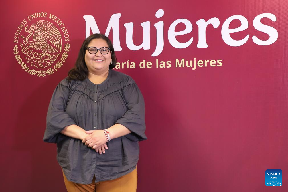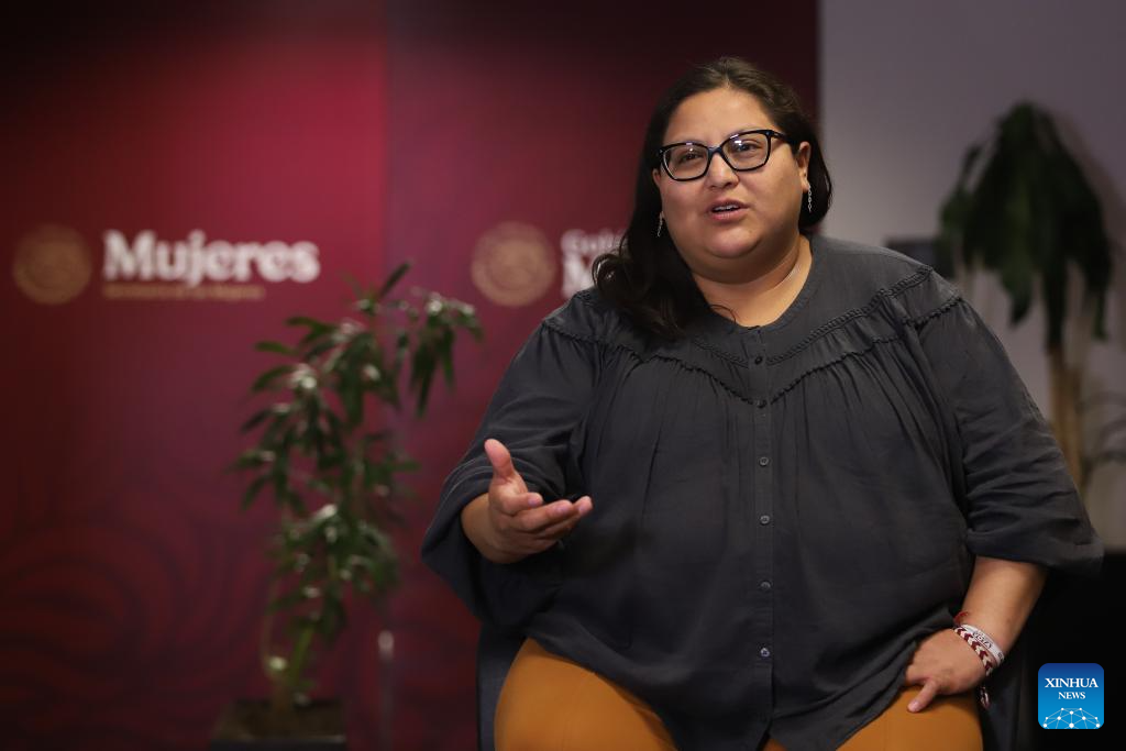 Citlalli Hernandez Mora, Mexico's minister for women, receives an interview with Xinhua in Mexico City, Mexico, Oct. 3, 2025. (Xinhua/Daniel Augusto)