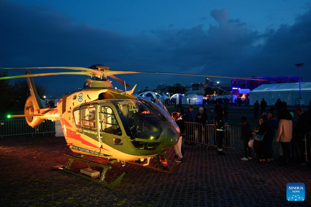 People view a Polish air ambulance helicopter during an aviation night event in Warsaw, Poland, Oct. 10, 2025. (Photo by Jaap Arriens/Xinhua)