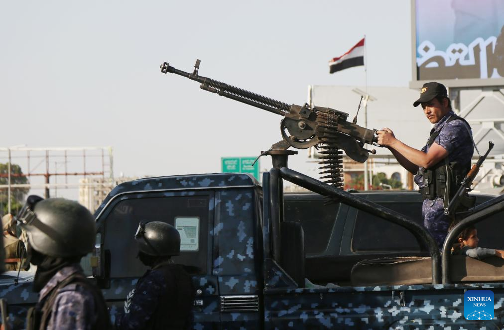 Houthi security soldiers guard during a rally to celebrate a cease-fire between Israel and Hamas, in Sanaa, Yemen, Oct. 10, 2025. Thousands of supporters of Yemen's Houthi group rallied Friday in the capital, Sanaa, to celebrate a cease-fire between Israel and Hamas, calling it a victory for Palestinians. (Photo by Mohammed Mohammed/Xinhua)