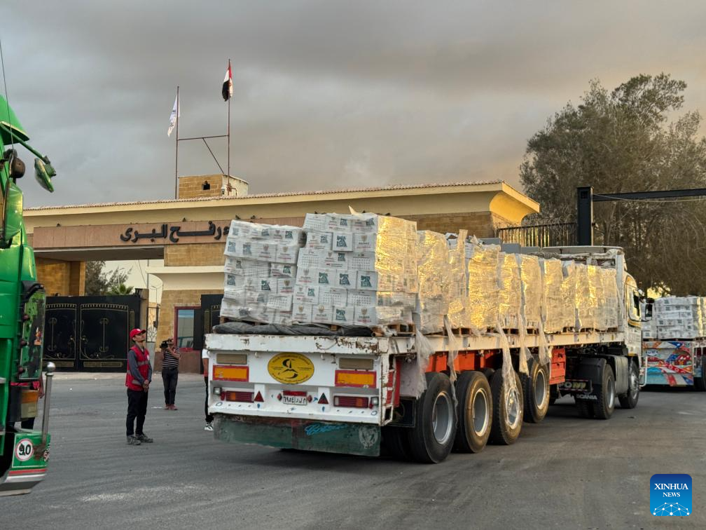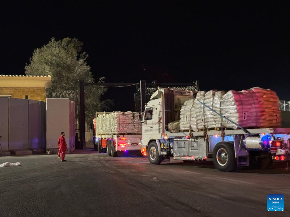 Trucks carrying humanitarian aids enter Gaza from the Egyptian side of the Rafah border crossing on Oct. 12, 2025. Egyptian President Abdel Fattah al-Sisi said on Friday that Egypt has begun sending urgent food and medical aid to the Gaza Strip following a ceasefire agreement between Israel and Hamas. (Photo by Ali Mostafa/Xinhua)