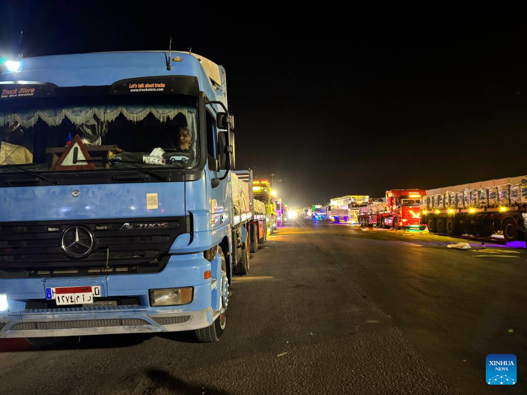 Trucks carrying humanitarian aids wait to enter Gaza at the Egyptian side of the Rafah border crossing on Oct. 12, 2025. Egyptian President Abdel Fattah al-Sisi said on Friday that Egypt has begun sending urgent food and medical aid to the Gaza Strip following a ceasefire agreement between Israel and Hamas. (Photo by Ali Mostafa/Xinhua)