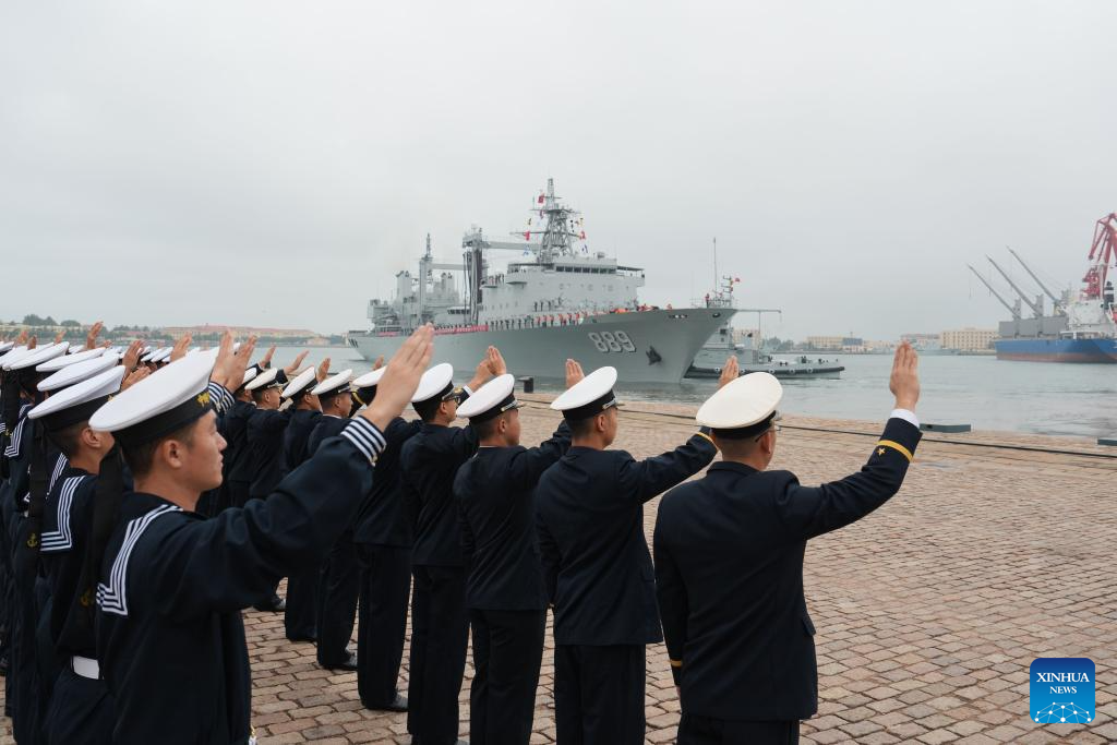 Officers and soldiers wave goodbye at a port in Qingdao, east China's Shandong Province, Oct. 11, 2025. A new fleet of the Chinese People's Liberation Army Navy set sail from a military port in Qingdao, east China's Shandong Province, on Saturday to take over an escort mission from the previous fleet in the Gulf of Aden and waters off Somalia.