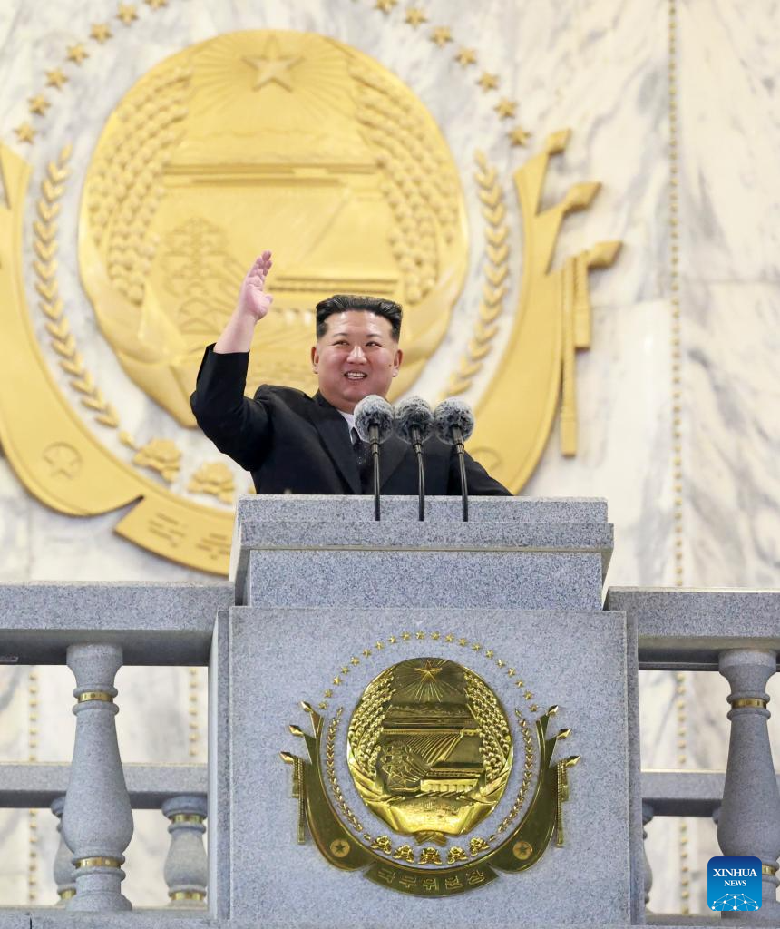 The DPRK held the parade Friday at Kim Il Sung Square in central Pyongyang. Kim Jong Un, general secretary of the WPK and president of the State Affairs of the DPRK, made a speech at the event. (Xinhua/Zhai Jianlan)