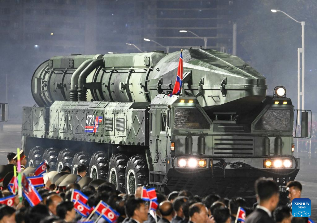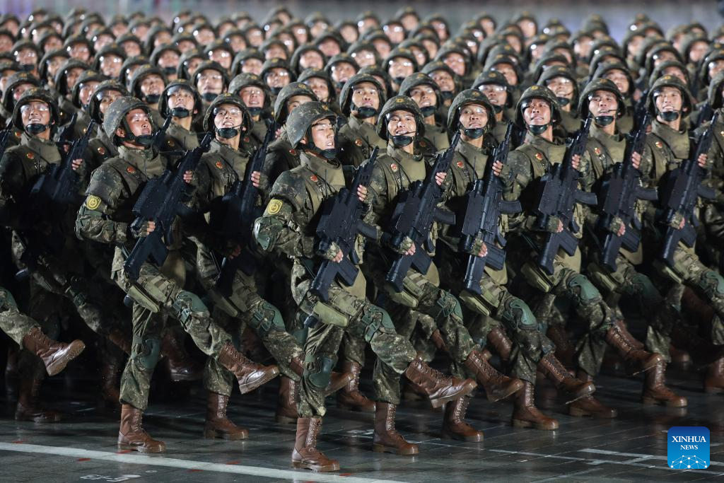 The DPRK held the parade Friday at Kim Il Sung Square in central Pyongyang. Kim Jong Un, general secretary of the WPK and president of the State Affairs of the DPRK, made a speech at the event. (Xinhua/Shen Hong)
