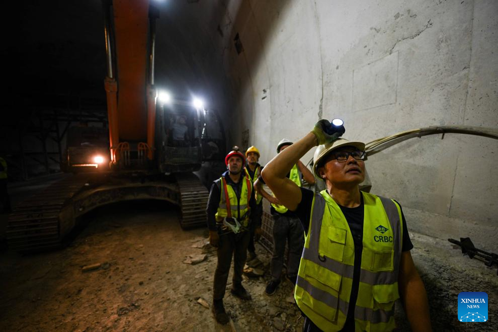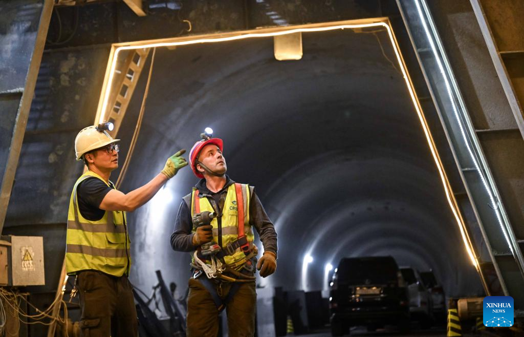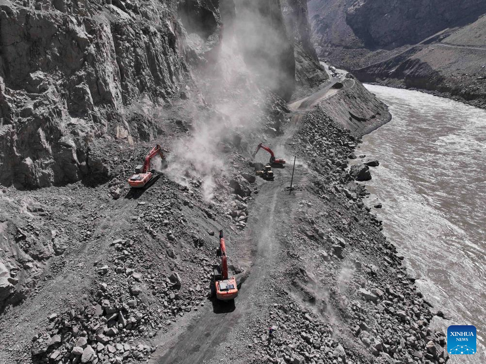 Workers are on duty at the construction site of the second-phase section of the China-Tajikistan Highway near Kalai Khumb, Tajikistan, on Sept. 11, 2025. The China-Tajikistan Highway -- also known as the Pamir Highway -- was first built in the 1940s. Stretching more than 1,000 km from Dushanbe to Karasu on the China-Tajikistan border, it is vital for Tajikistan's transport and external links.