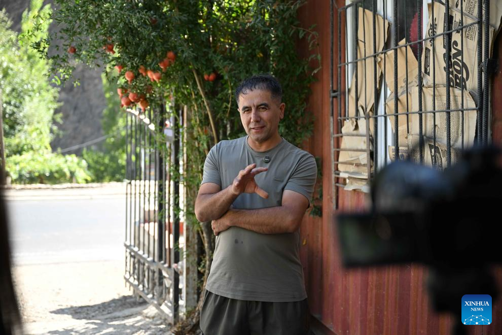 Villager Kishwar speaks during an interview at his home beside the second-phase section of the China-Tajikistan Highway near Kalai Khumb, Tajikistan, on Sept. 11, 2025. The China-Tajikistan Highway -- also known as the Pamir Highway -- was first built in the 1940s. Stretching more than 1,000 km from Dushanbe to Karasu on the China-Tajikistan border, it is vital for Tajikistan's transport and external links.